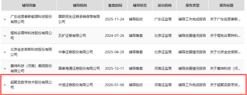 2025年12月31日,超聚变与中信证券签署了辅导协议,于当日向河南证监局报送了辅导备案登记材料,并于2026年1月6日获受理,自受理之日起正式进入辅导期。
