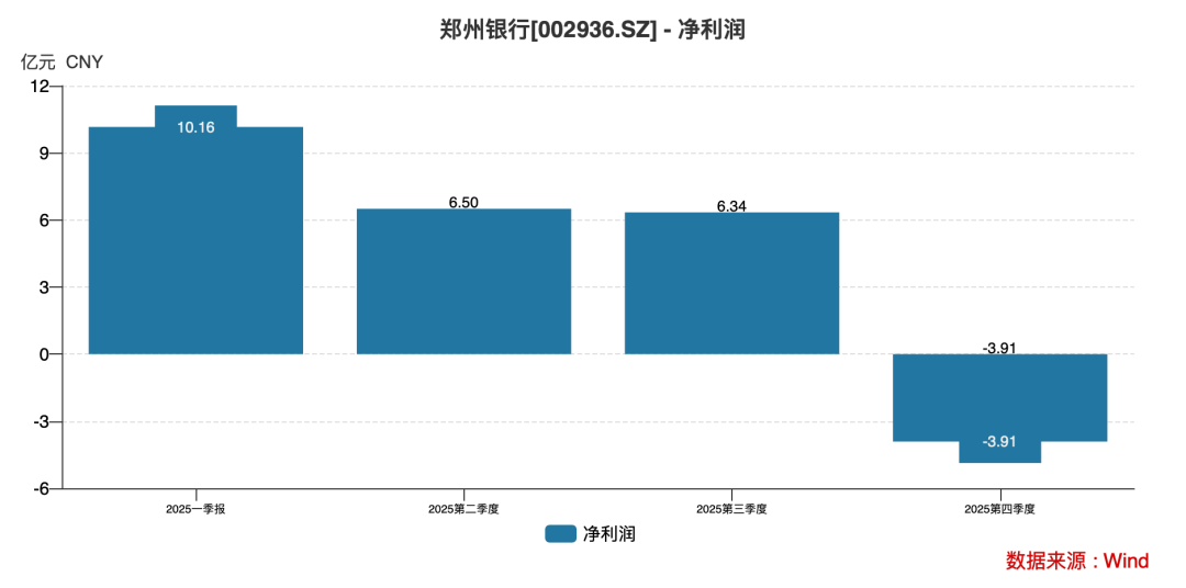 最引人关注的是季度业绩的剧烈波动。2025 年前三季度,郑州银行累计实现归母净利润22.79亿元,但第四季度却单季净亏损3.84亿元,一举吞噬前三季度近17%的盈利。