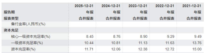 截至2025年末,郑州银行核心一级资本充足率降至8.45%,较上年末下降31个BP,也已经逼近7.5%的监管红线;一级资本充足率10.44%,下降37个BP;资本充足率下降35个BP,至11.71%。