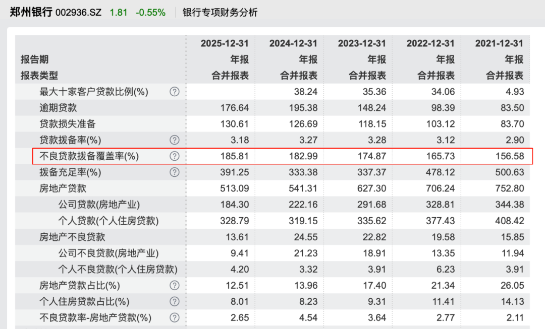 上述多个领域不良贷款率提升的同时,郑州银行的风险抵补能力也面临挑战。数据显示,2025年末,郑州银行拨备覆盖率为185.81%,较年初提升 2.82%,但仍长期低于全国商业银行200%~220%的平均水平。