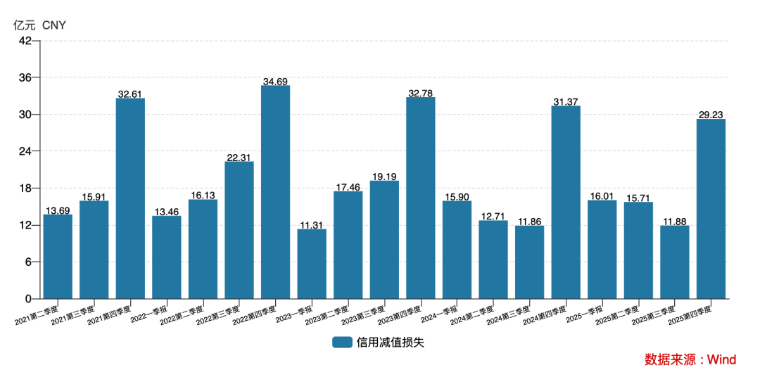 究其原因是,年末集中计提巨额信用减值。数据显示,2025 年全年计提信用减值损失72.82亿元,其中第四季度占比又超过四成。
