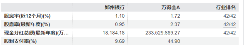 尽管2024年曾有过分红,每10股派现0.2元,合计派发约1.82亿元,但郑州银行最近12个月股息率、最新年度股息率及最新年度现金分红总额,在42家A 股上市银行中均排名倒数第一。其9.69%的股利支付率,也远低于万得全A平均值44.9%。