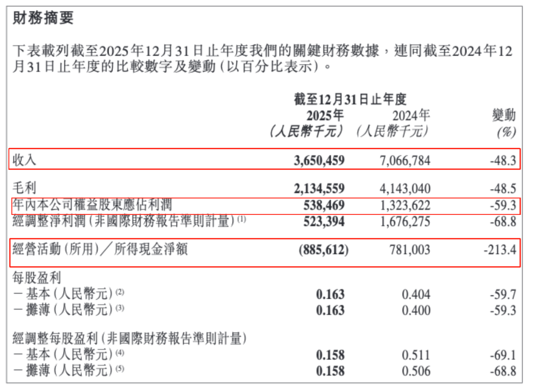 近日,珍酒李渡(06979.HK)发布的业绩公告显示,2025年公司营收同比下降48.3%至36.51亿元,归母净利润则跌至5.39亿元,同比下降59.3%。