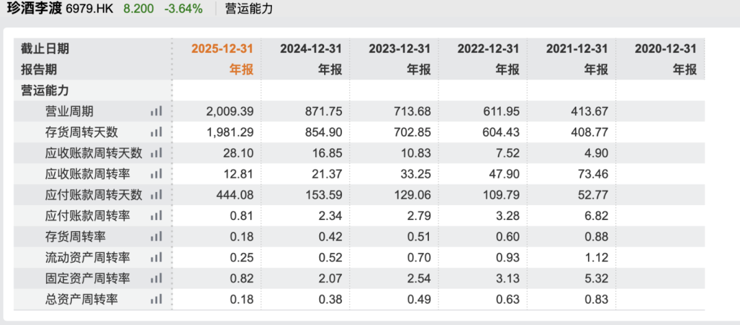 众所周知,营业周期由存货和应收账款的周转天数构成。2025年末,珍酒李渡的存货周转天数与应收账款周转天数,分别为1981天和28天。