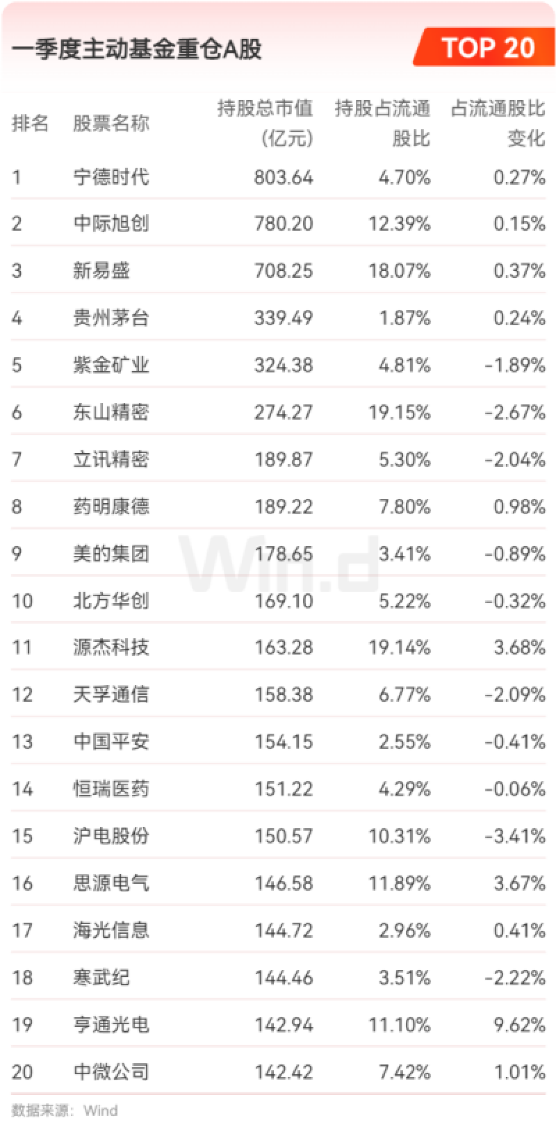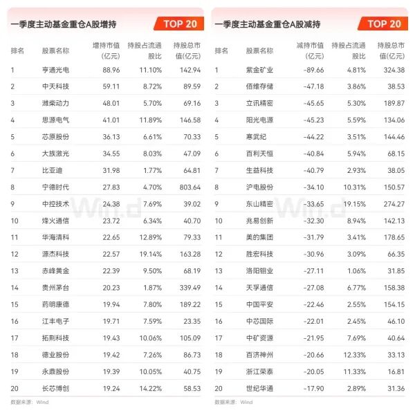 值得注意的是,贵州茅台和药明康德也获增持,但排名相对靠后。整体来看,一季度基金增持方向高度集中在光通信、电力设备、半导体设备及部分周期资源品领域。