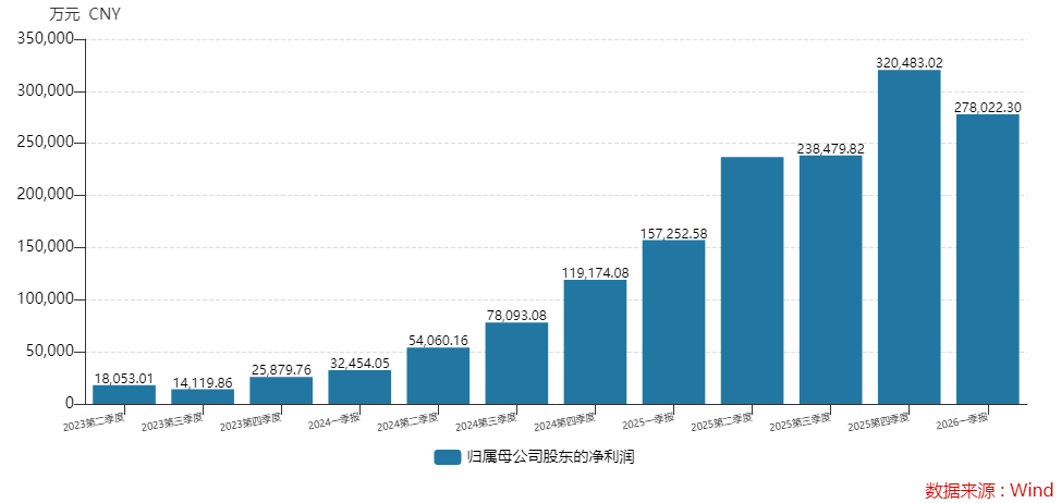 更受关注的是一季报。2026年一季度公司实现营业收入83.38亿元,同比增幅105.76%;归母净利润27.80亿元,同比增长76.80%。