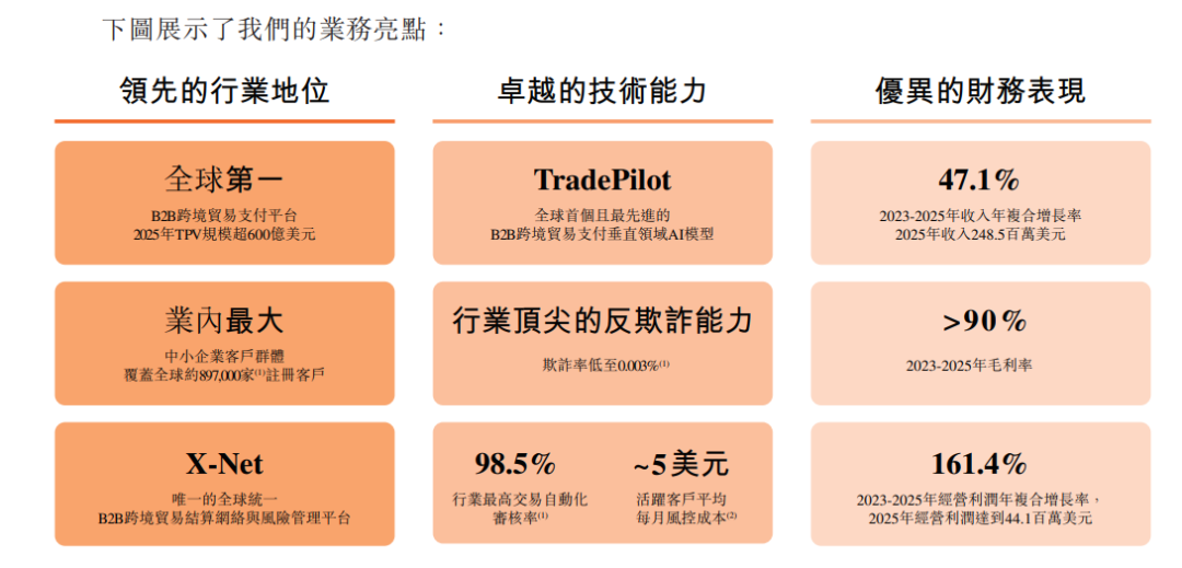 公司表示,自身技术能力的核心体现于TradePilot。根据灼识咨询的资料,TradePilot是全球首个且最先进的B2B跨境贸易支付垂直领域AI模型。随着TradePilot全面嵌入运营体系,截至2026年3月31日,超过98.5%的交易已实现自动化审核,客服自动化解决率从2023年的约13%提高至2025年的超过88%,在往绩记录期间,公司的交易风险管理成本下降了约50%。这些运营与体验的改善,最终推动了TPV、收入和盈利能力的强劲增长。
