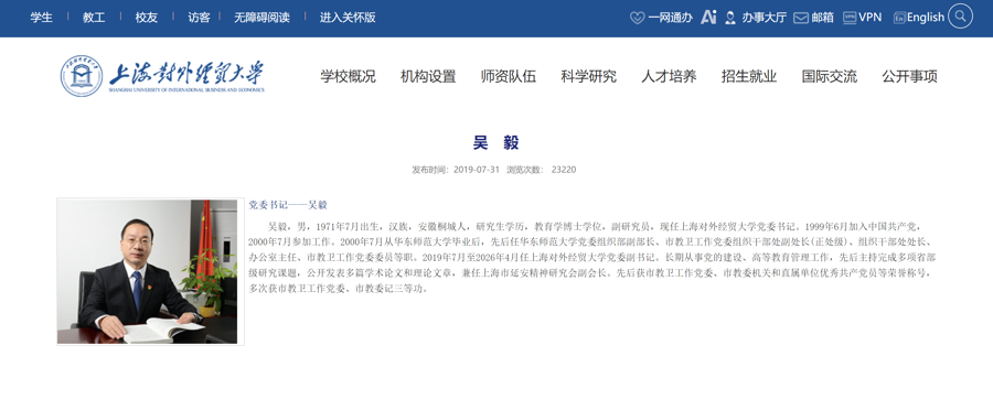 吴毅,男,1971年7月出生,汉族,安徽桐城人,研究生学历,教育学博士学位,副研究员,现任上海对外经贸大学党委书记。