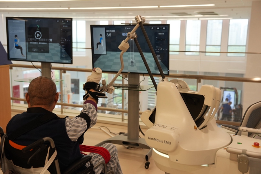 图说:同济附属养志康复医院患者使用康复机器人进行康复。