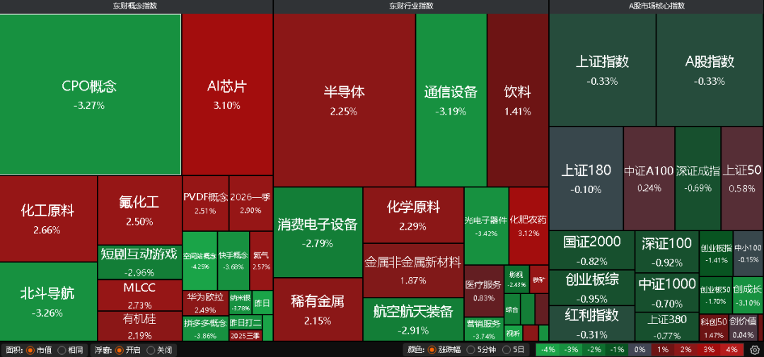 A股主要指数昨日走势分化,截止收盘,沪指跌0.33%,深证成指跌0.69%,创业板指跌1.41%。沪深京三市成交额26580亿,较昨日缩量1656亿。行业板块涨少跌多,能源金属、农化制品、电池、工业金属、半导体板块涨幅居前,航天装备、地面兵装、电力、影视院线、公用事业板块跌幅居前。
