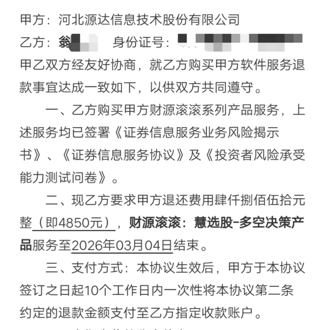 因对投顾服务的不认可,翁先生未使用相关投顾产品,并提出退款。3月5日,翁先生与河北源达签订退款协议,约定服务结束,10个工作日内退款4850元(扣除130元“开户费”)。但截至记者发稿,退款仍未到账。