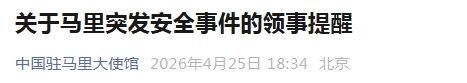 驻马里使馆提醒中国公民暂勿前往马里,在马中国公民务必提高安全防范意识,密切关注安全形势,远离危险地区,非必要不外出。如遇危急情况,应保持冷静,务必将确保人身安全放在首位,在保证自身安全前提下及时报警并与中国驻马里使馆取得联系。