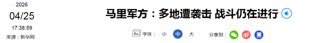 此前,新华社报道员从马里安全部门人士处获悉,马里多地25日清晨传出爆炸声和枪声,涉及首都巴马科附近驻军城镇卡蒂、巴马科国际机场方向部分区域、东北部基达尔区基达尔市、北部加奥区加奥市,以及中部莫普提区塞瓦雷市等地。