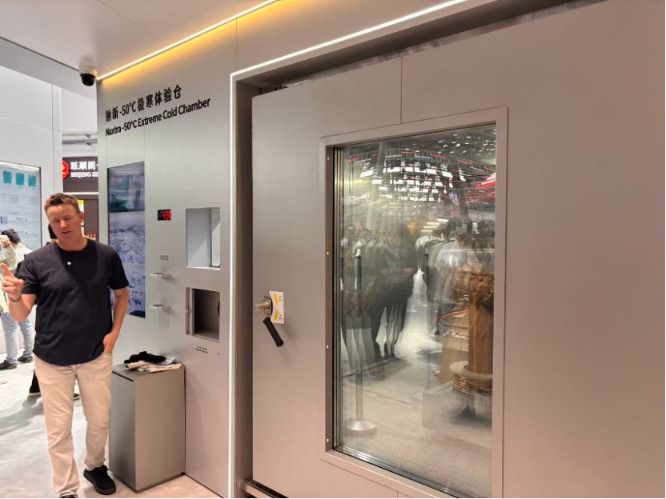 记者也将手臂伸入体验仓内,即使戴着手套,也能明显感受到刺骨的寒意。宁德时代展台工作人员向记者介绍:“在零下30℃条件下,搭载宁德时代钠新电池的整车放电功率,较同电量常规铁锂车型提升近3倍;零下40℃极寒下容量保持率超90%;甚至在零下50℃极端环境,还能稳定放电。”