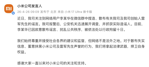 小米:捏造散布涉小米及雷军谣言的李某华,被行政拘留