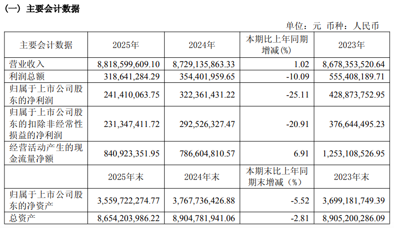 而2025年公司归母净利润同比下降25.11%至2.41亿元;扣非净利润同比下降20.91%至2.31亿元,均为连续第二年双位数下滑。