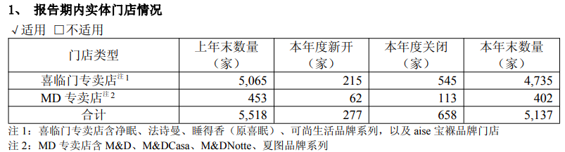 2025年,喜临门专卖店新开215家,关闭545家,从上年末的5065家降至4735家,减少330家;MD专卖店新开62家,关闭113家,从上年末的453家降至402家,减少51家。这意味着,一年间,喜临门门店总数减少了381家。