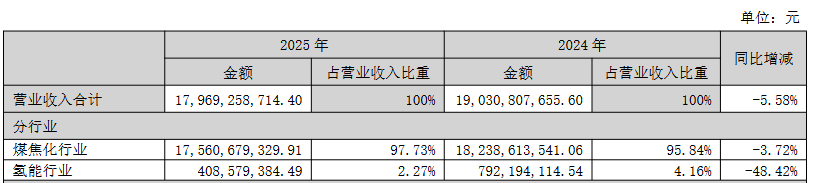 从收入构成来看,公司煤焦化行业收入占比高达97.73%,氢能行业仅占2.27%。2025年氢能行业收入同比大幅下降48.42%,从7.92亿元降至4.09亿元,未能形成有效的业绩支撑。这种高度依赖煤焦主业的业务结构,使公司在煤焦市场下行周期中缺乏有效的对冲手段。
