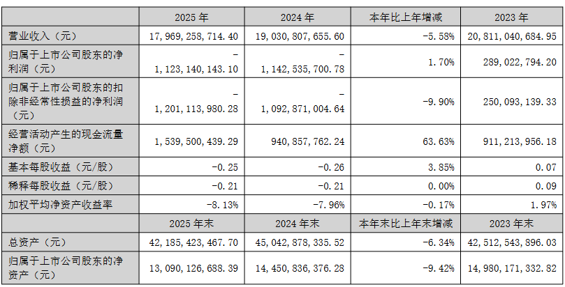 4月25日,美锦能源(000723)公告,2025年实现营业收入179.69亿元,同比下降5.58%;归母净利润亏损11.23亿元,同比减亏1.70%;扣非净利润-12.01亿元,同比减亏-9.90%。公司计划不分红。
