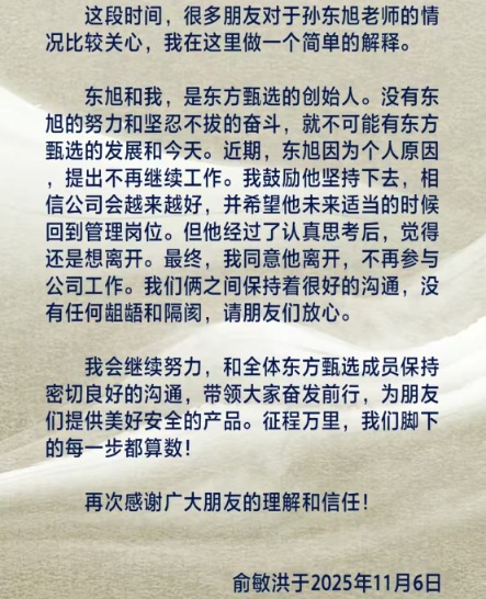 2025年11月6日,俞敏洪在个人抖音账号发文确认东方甄选原行政总裁孙东旭离职。