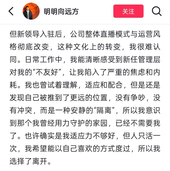 主播明明直言,公司新管理层入驻后,整体直播模式与运营风格彻底改变,“这种文化上的转变,我很难认同”。主播中灿则表示,过去几个月公司发生了很多变化,新的管理团队入驻后的很多规则、很多方式都和当初不一样……