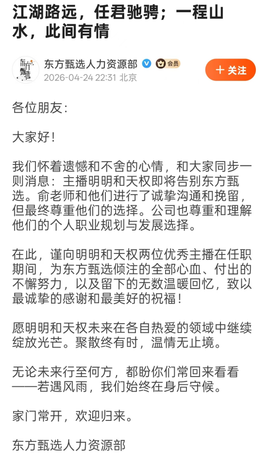 而在上述主播宣布离职前一天,东方甄选人力资源部于4月24日在东方甄选APP社区中发文,确认了明明和天权将离职的消息,离职原因为个人职业规划与发展选择。其称俞敏洪已与二人进行了诚挚沟通和挽留,但尊重主播的选择。