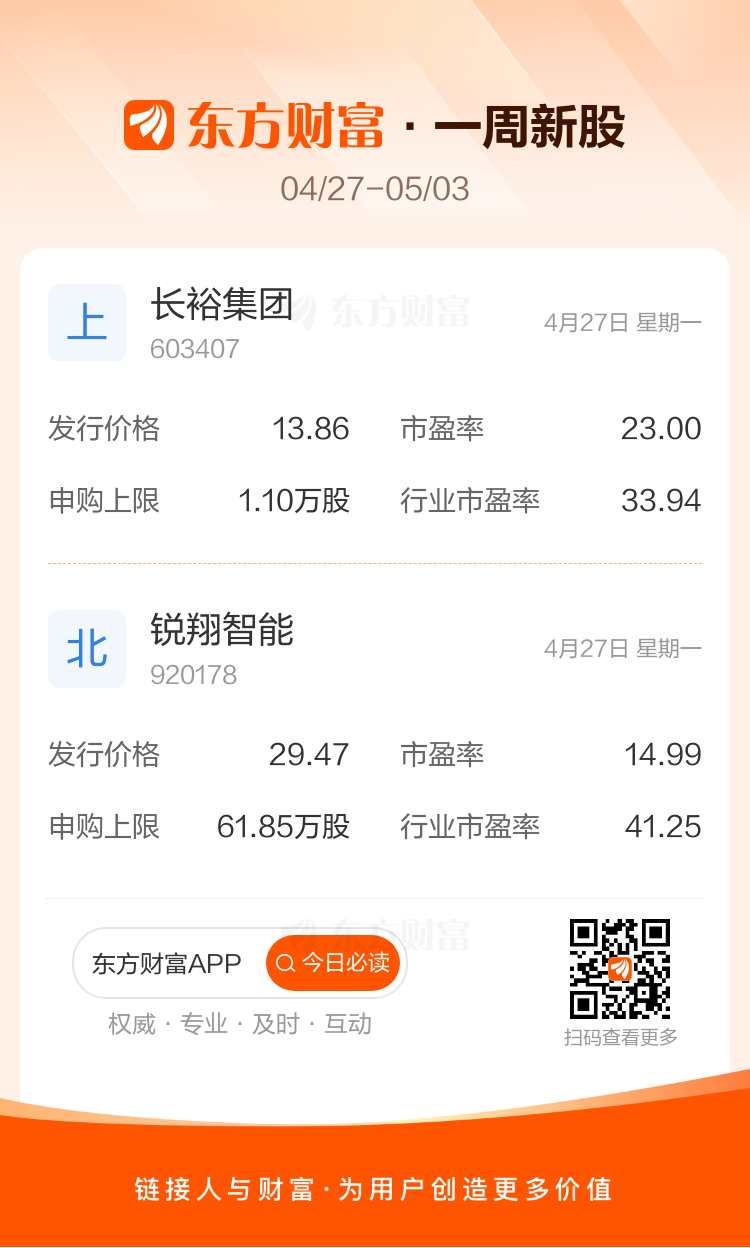下周(4月27日至5月3日)沪深北三市有2只新股申购,分别为长裕集团、锐翔智能。