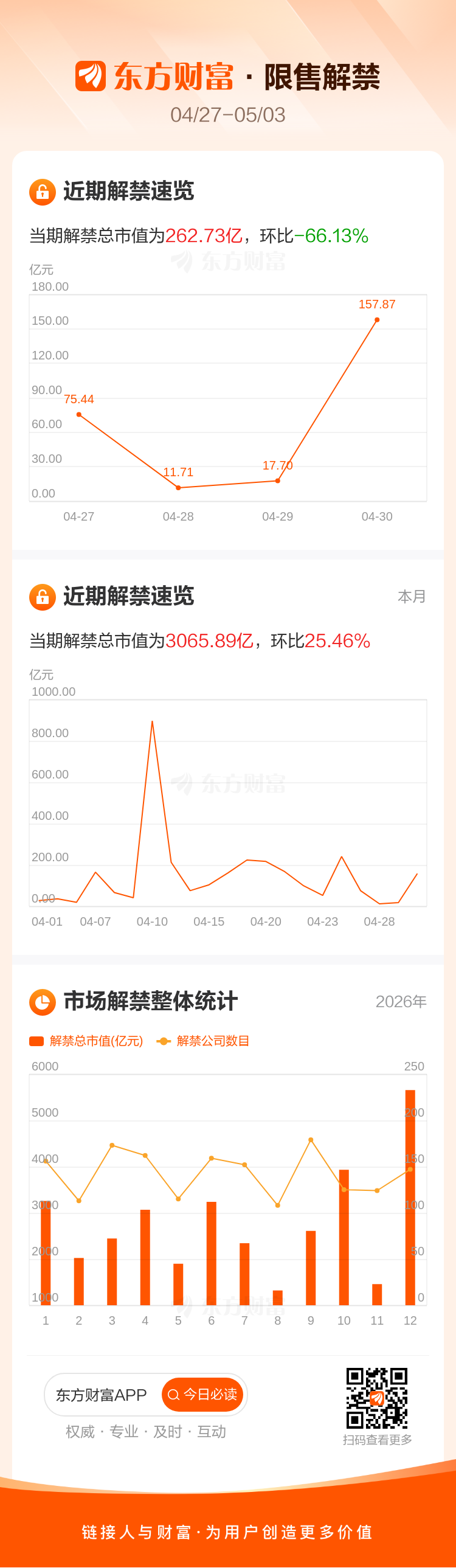 下周(4月27日至5月3日)有35家公司限售股陆续解禁,当期解禁总市值为262.73亿元,-66.13%。