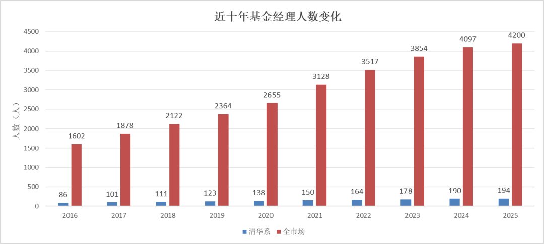 再看公募行业,据天相投顾基金评价中心统计,截至2026年4月17日,清华系公募基金经理(在管产品)人数逾190人,其中硕士学历超160人,博士30人;将在管产品规模进行汇总,合计管理规模为1.86万亿元。