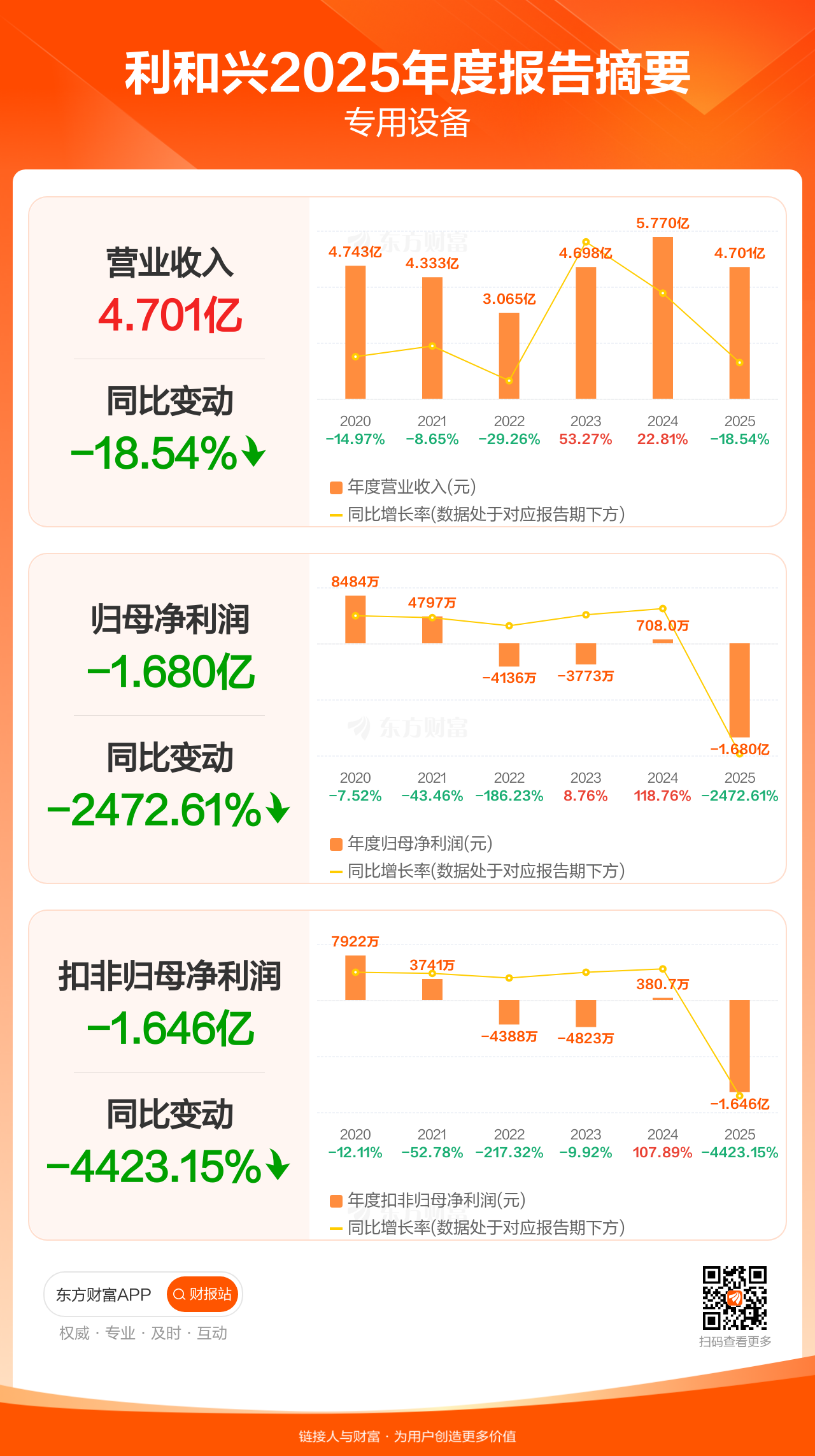 利和兴4月27日发布2025年年报显示,公司全年实现营业收入4.70亿元,同比下滑18.54%;归母净利润-1.68亿元;扣非归母净利润-1.65亿元。