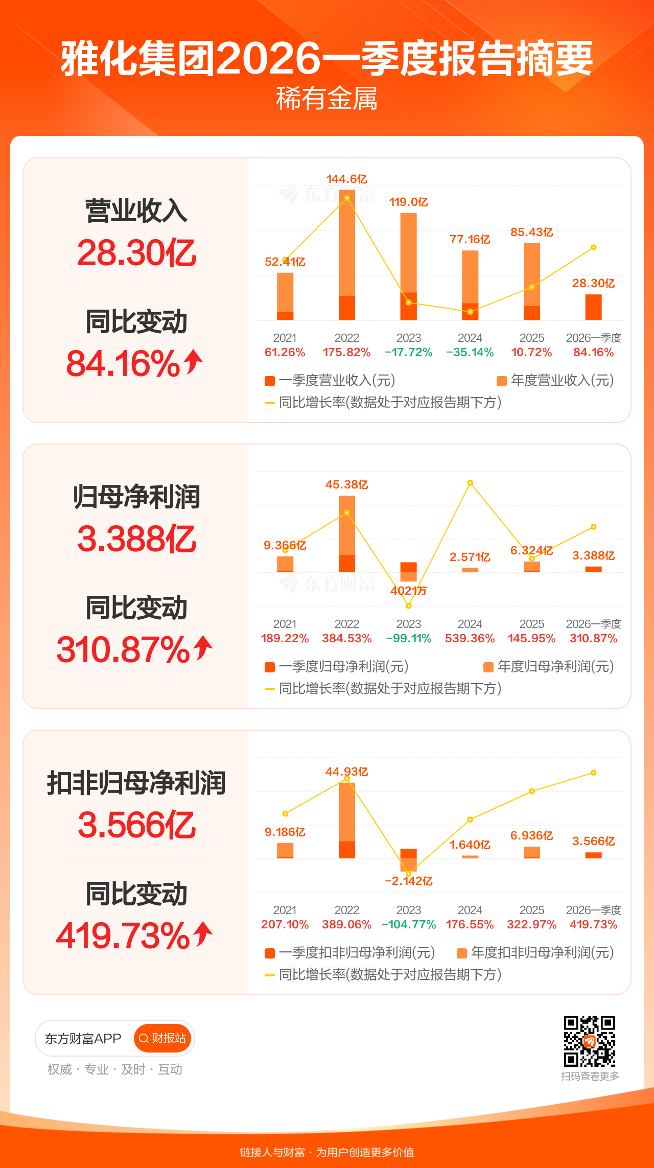 雅化集团4月27日发布2026年一季报显示,公司一季度实现营业收入28.30亿元,同比增长84.16%;归母净利润3.39亿元,同比增长310.87%;扣非归母净利润3.57亿元,同比增长419.73%。