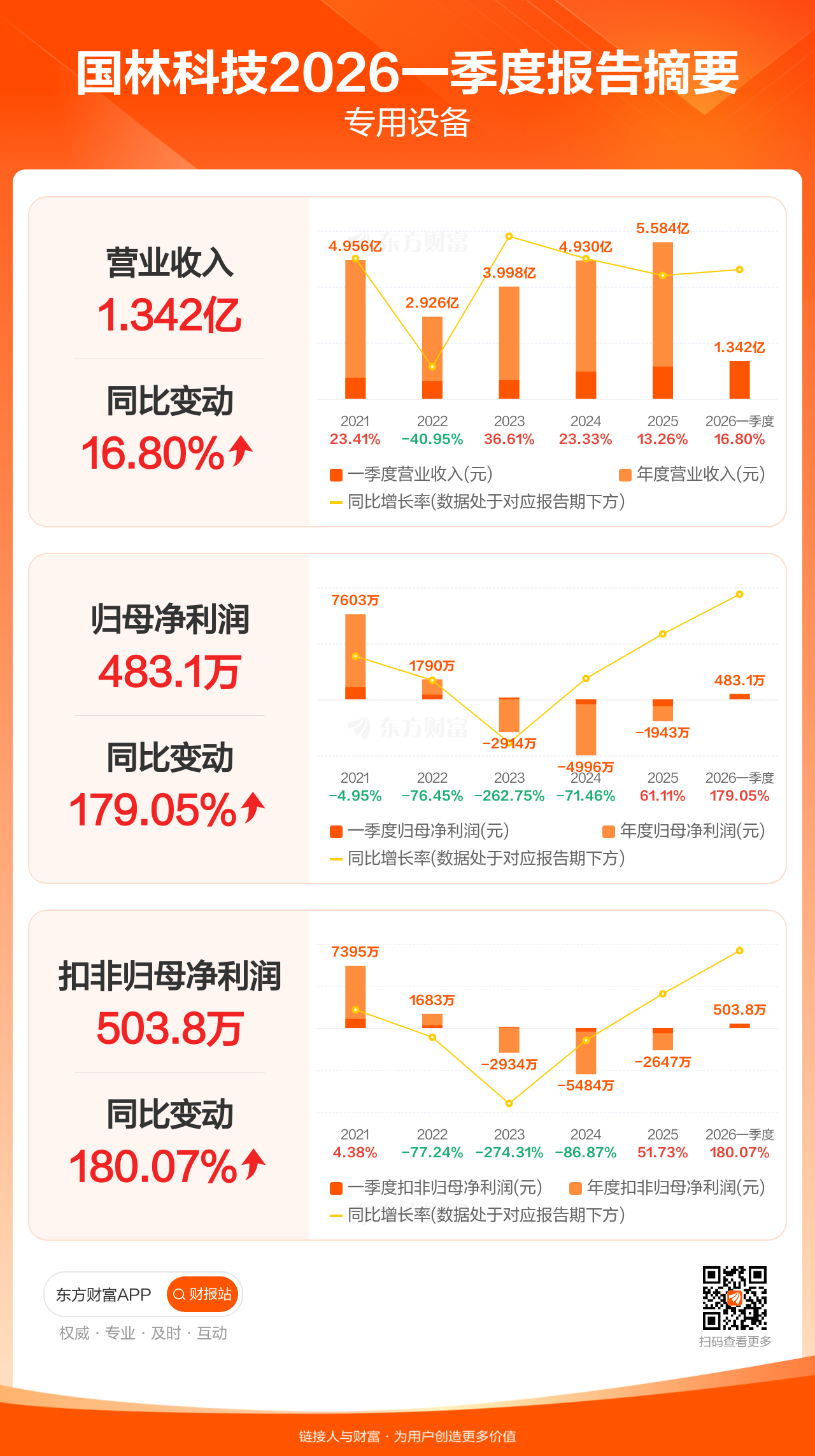 国林科技4月27日发布2026年一季报显示,公司一季度实现营业收入1.34亿元,同比增长16.80%;归母净利润483.08万元,同比增长179.05%;扣非归母净利润503.75万元,同比增长180.07%。