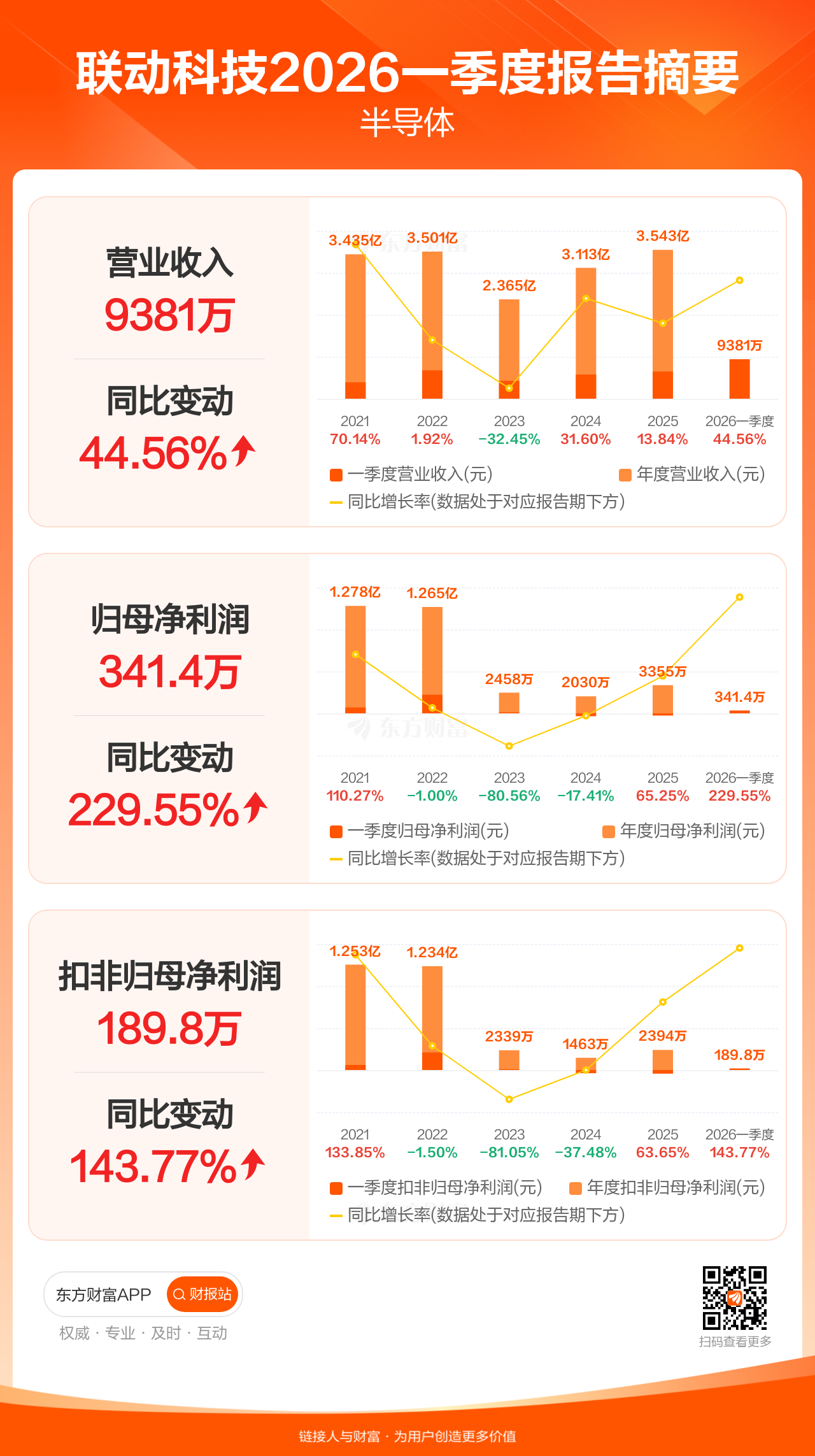 联动科技4月27日发布2026年一季报显示,公司一季度实现营业收入9380.96万元,同比增长44.56%;归母净利润341.44万元,同比增长229.55%;扣非归母净利润189.85万元,同比增长143.77%。