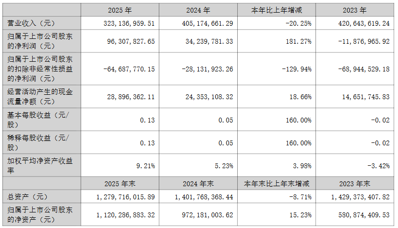 4月25日,亚太药业(002370.SZ)发布2025年年报显示,公司2025年营业收入为3.23亿元,同比下降20.25%;归母净利润为0.96亿元,同比增长181.27%;扣非净利润为-0.65亿元,同比下降129.94%。