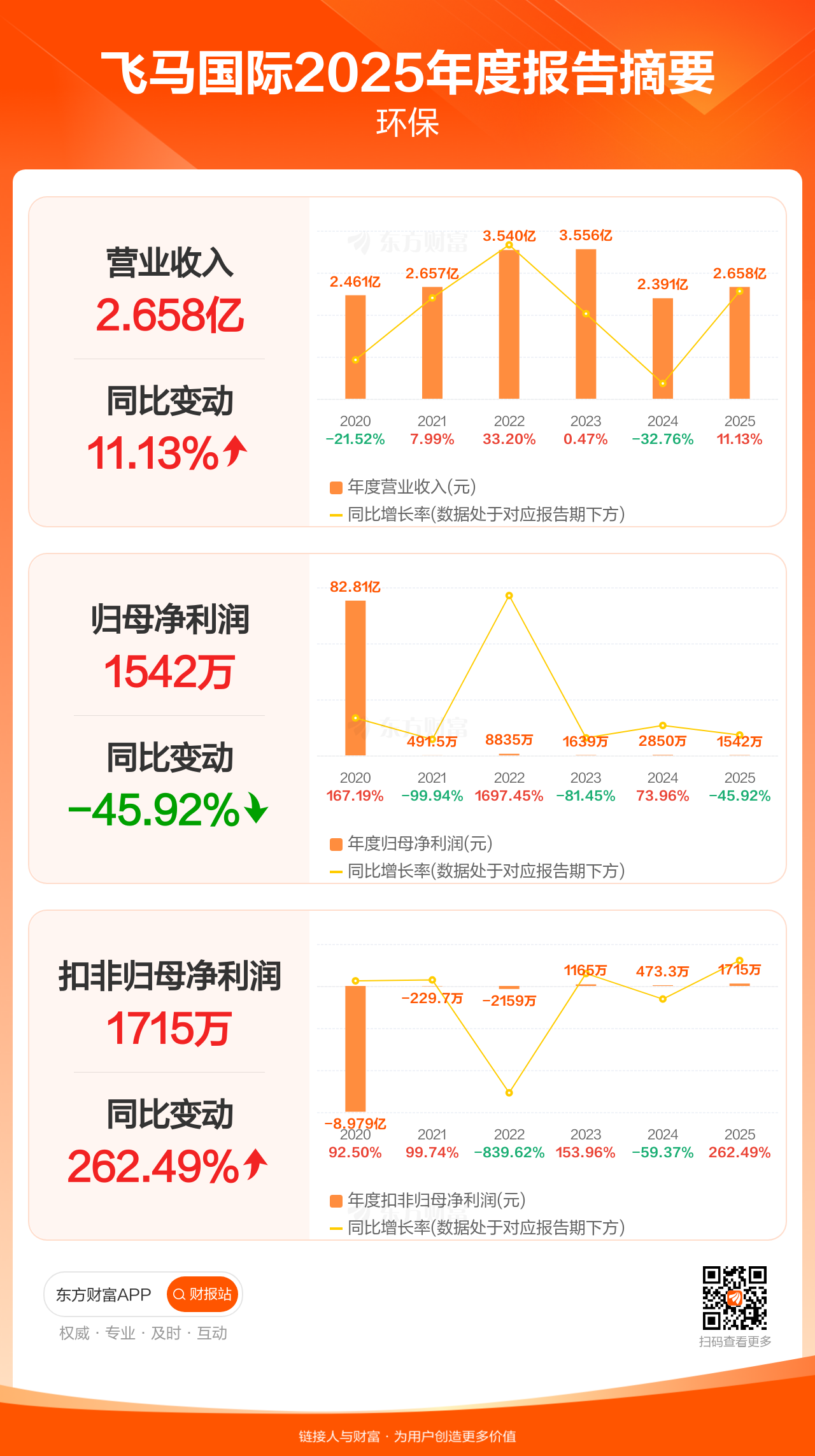 飞马国际4月27日发布2025年年报显示,公司全年实现营业收入2.66亿元,同比增长11.13%;归母净利润1541.60万元,同比下滑45.92%;扣非归母净利润1715.50万元,同比增长262.49%。