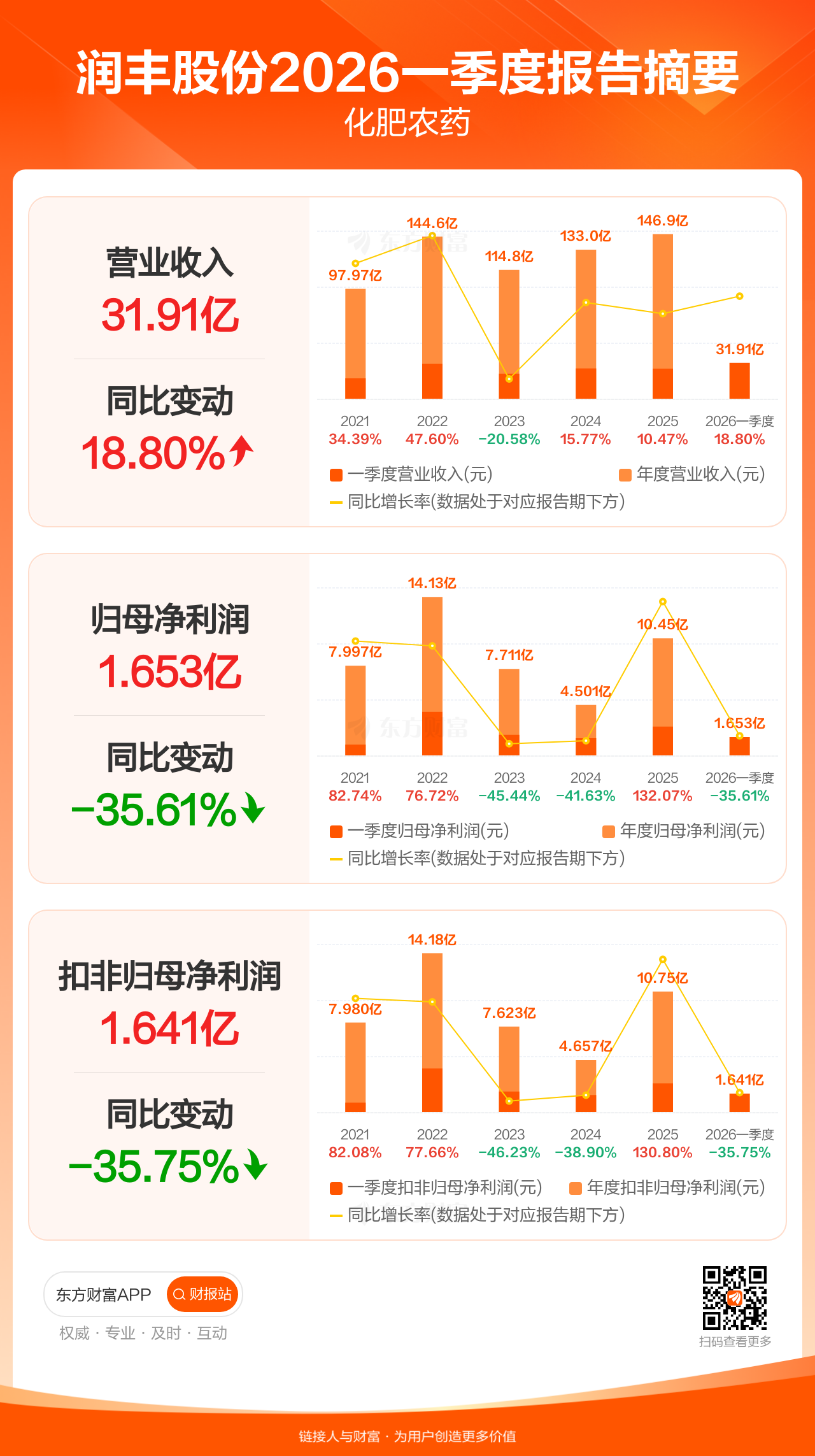 润丰股份4月27日发布2026年一季报显示,公司一季度实现营业收入31.91亿元,同比增长18.80%;归母净利润1.65亿元,同比下滑35.61%;扣非归母净利润1.64亿元,同比下滑35.75%。