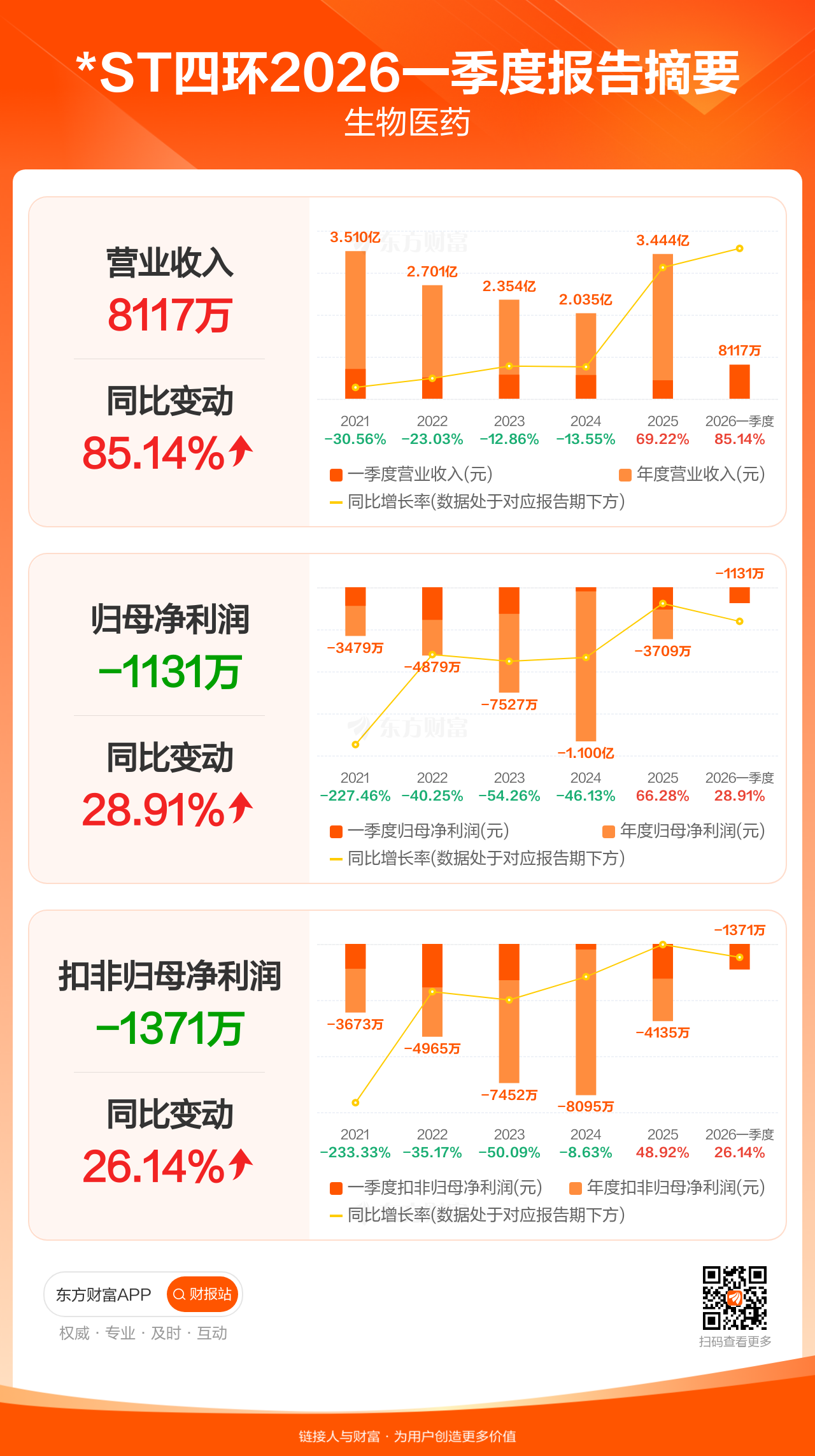 *ST四环4月27日发布2026年一季报显示,公司一季度实现营业收入8117.03万元,同比增长85.14%;归母净利润-1131.38万元;扣非归母净利润-1371.28万元。