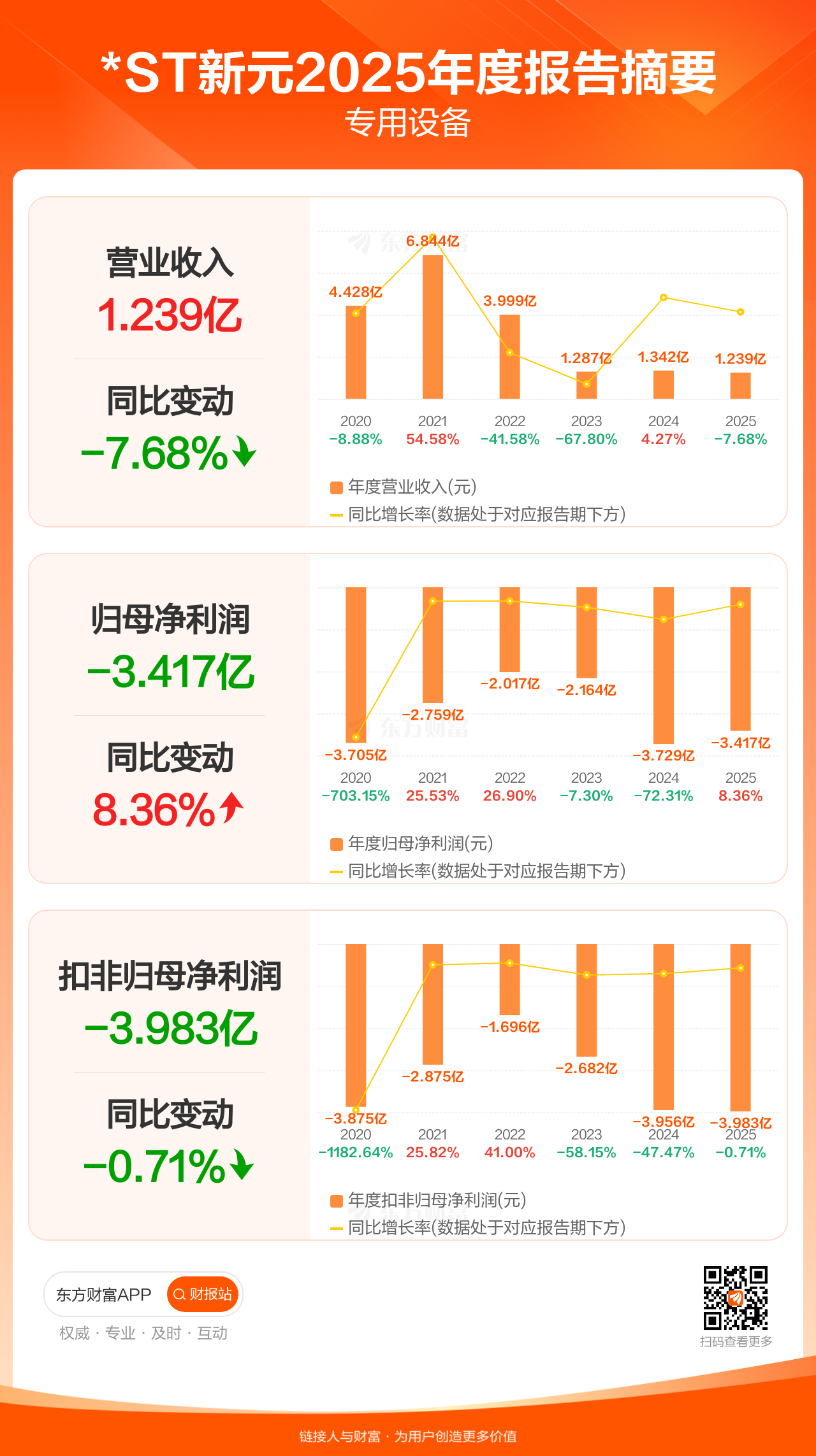 *ST新元4月27日发布2025年年报显示,公司全年实现营业收入1.24亿元,同比下滑7.68%;归母净利润-3.42亿元;扣非归母净利润-3.98亿元。