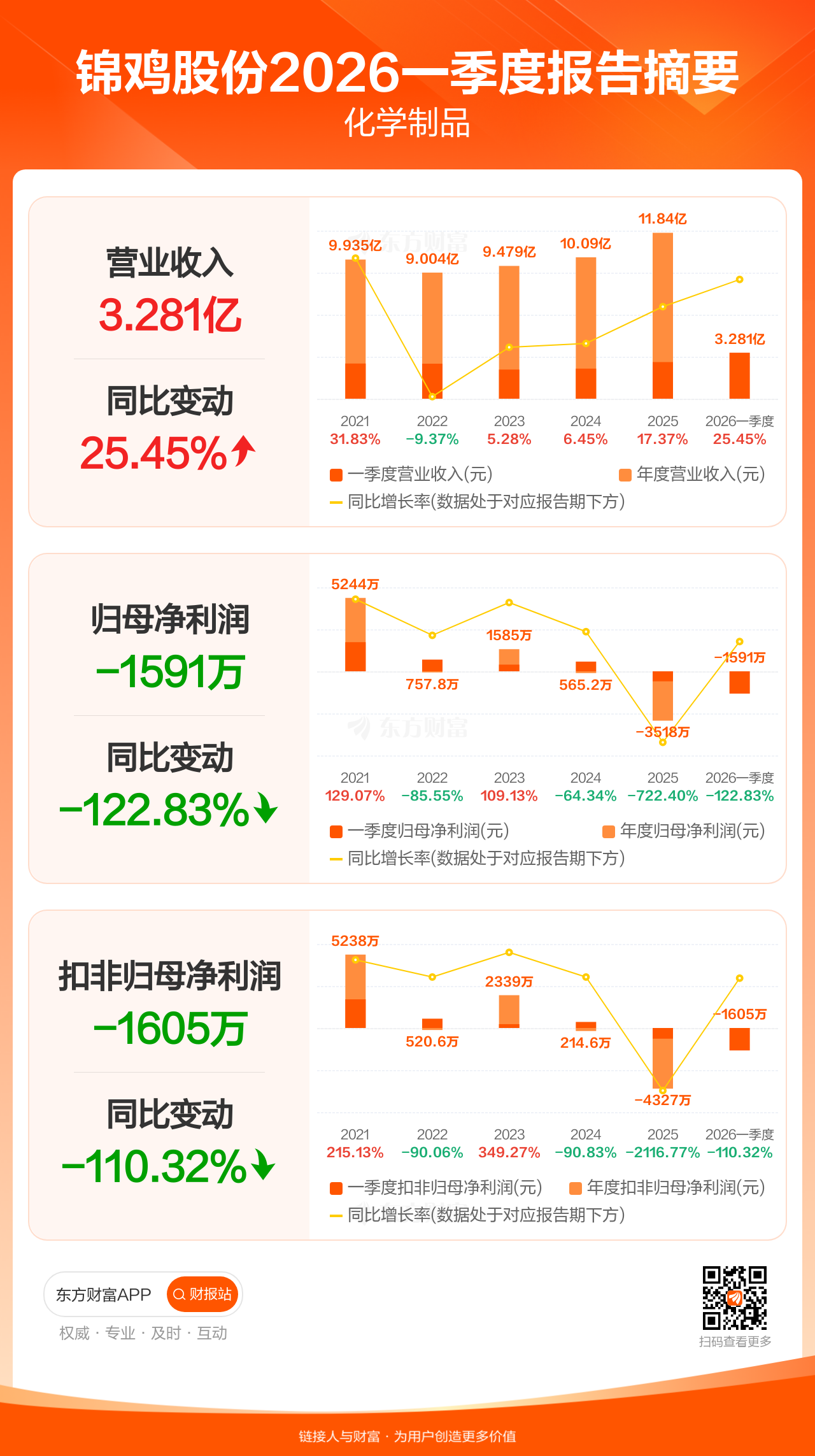 锦鸡股份4月27日发布2026年一季报显示,公司一季度实现营业收入3.28亿元,同比增长25.45%;归母净利润-1591.23万元;扣非归母净利润-1605.30万元。