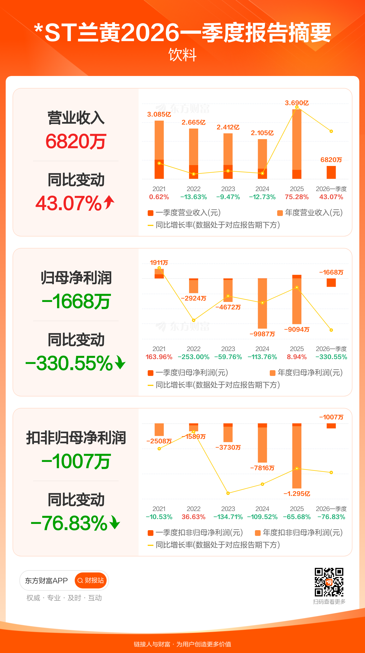 *ST兰黄4月27日发布2026年一季报显示,公司一季度实现营业收入6820.42万元,同比增长43.07%;归母净利润-1667.50万元;扣非归母净利润-1007.17万元。