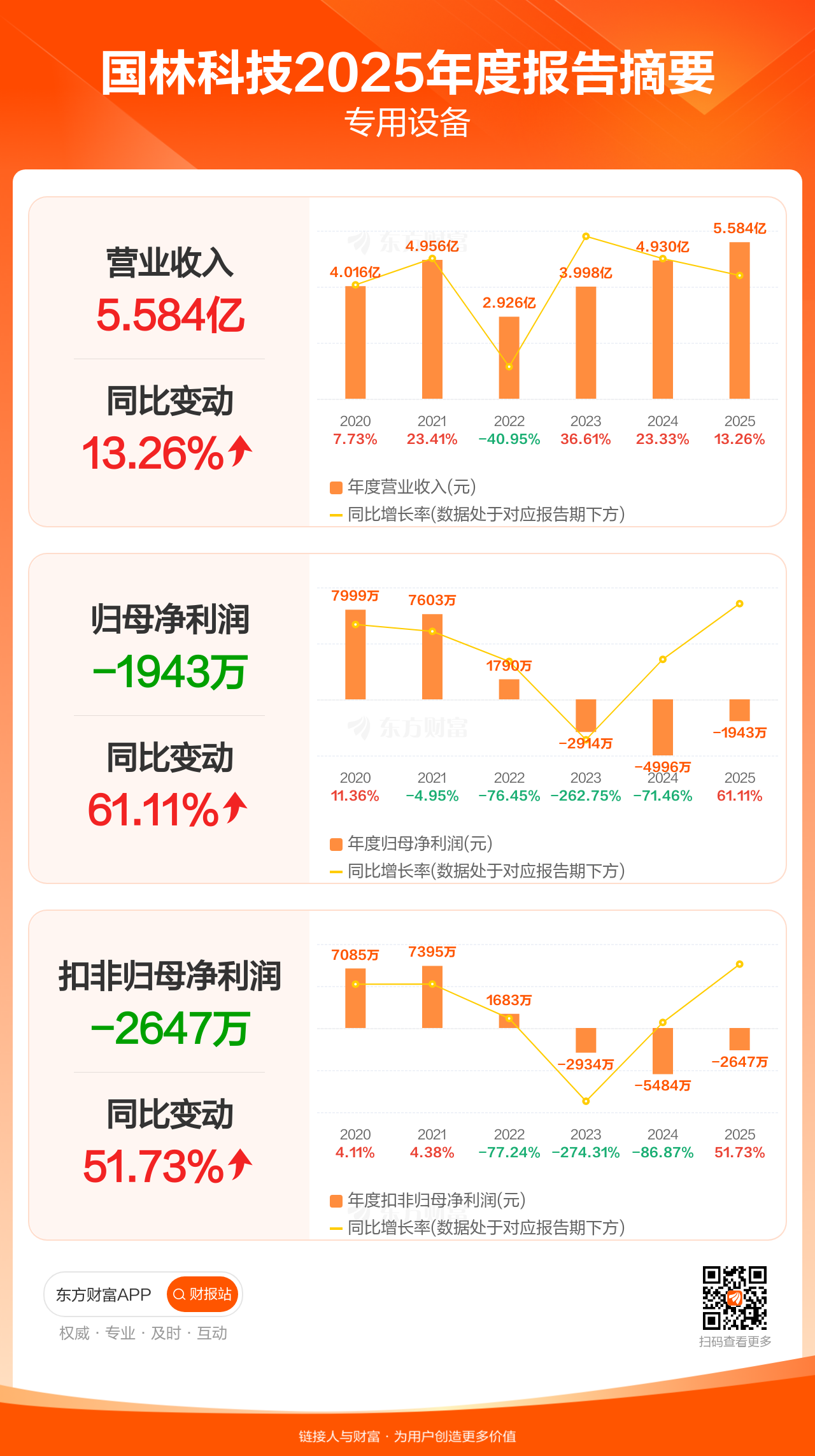 国林科技4月27日发布2025年年报显示,公司全年实现营业收入5.58亿元,同比增长13.26%;归母净利润-1942.94万元;扣非归母净利润-2647.03万元。