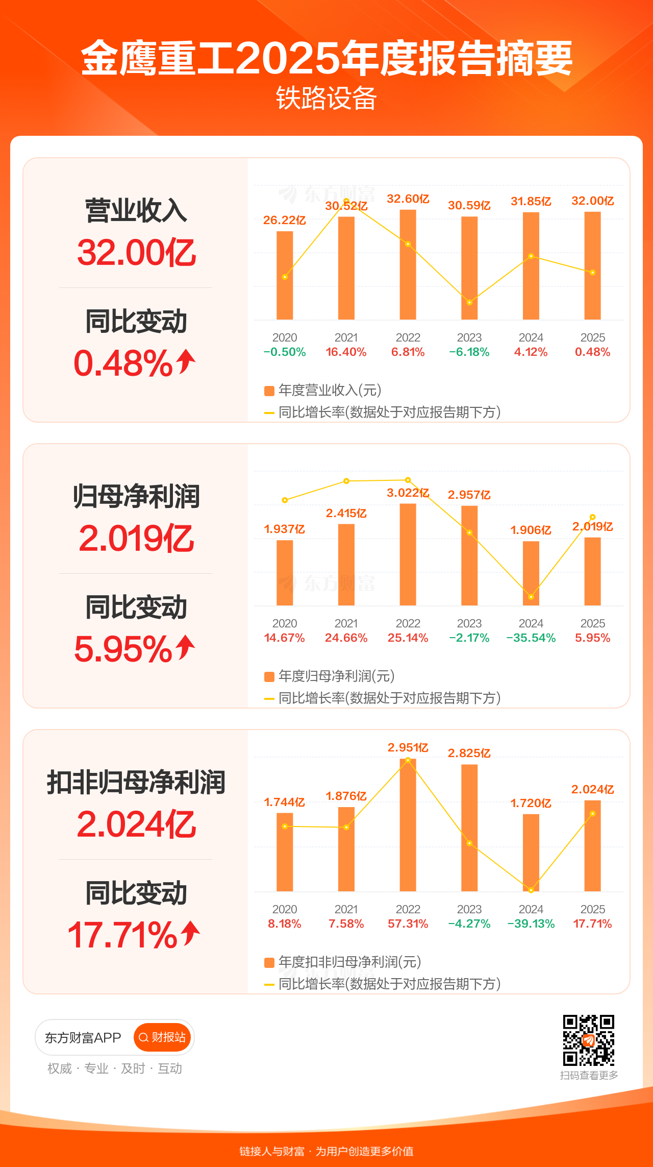 金鹰重工4月27日发布2025年年报显示,公司全年实现营业收入32.00亿元,同比增长0.48%;归母净利润2.02亿元,同比增长5.95%;扣非归母净利润2.02亿元,同比增长17.71%。