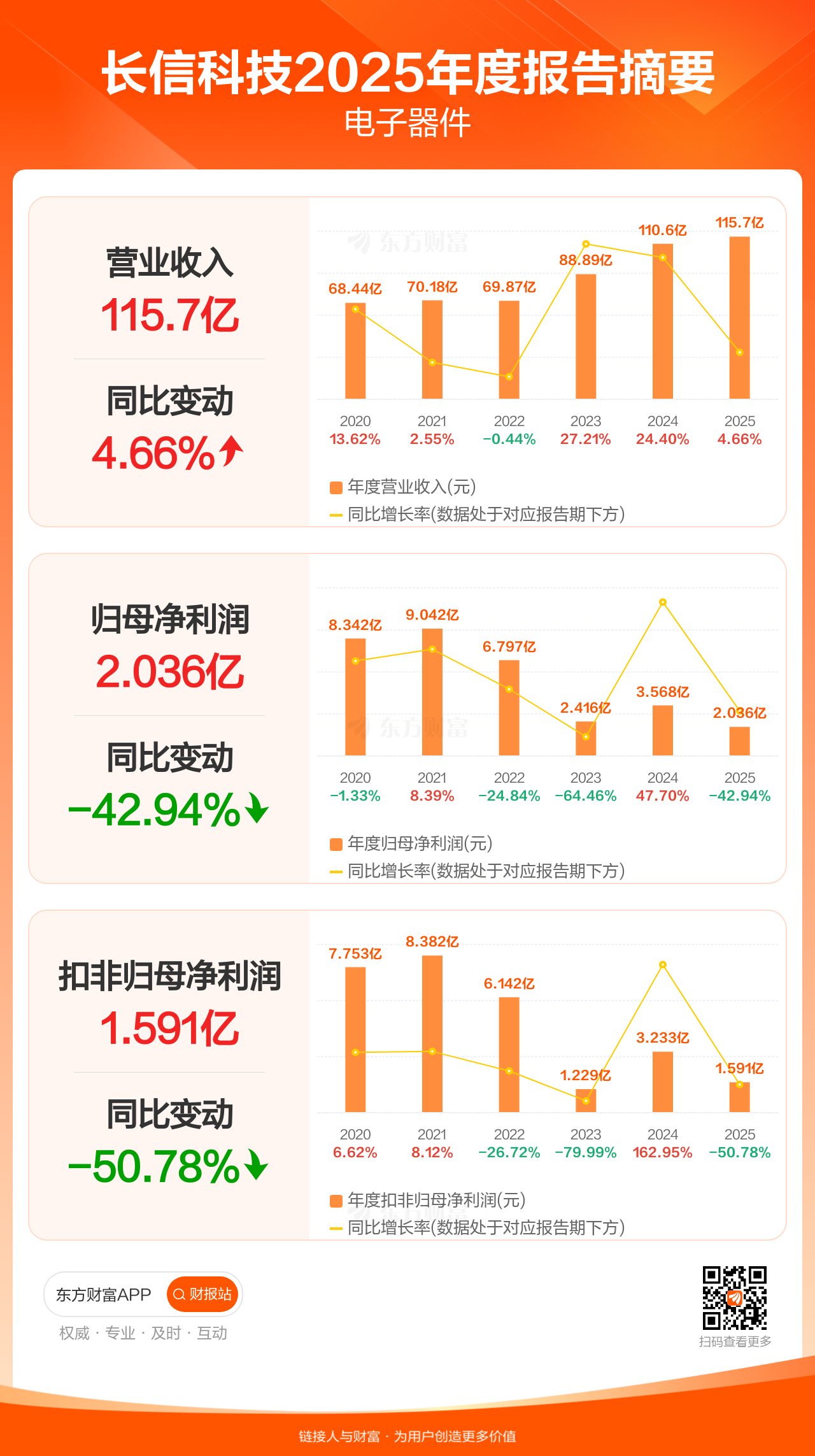 长信科技4月27日发布2025年年报显示,公司全年实现营业收入115.73亿元,同比增长4.66%;归母净利润2.04亿元,同比下滑42.94%;扣非归母净利润1.59亿元,同比下滑50.78%。