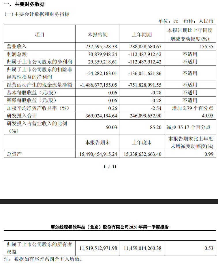 2026年一季度,摩尔线程实现营收7.38亿元,同比增长155.35%;归母净利润0.29亿元,同比增加1.42亿元,同比扭亏为盈;归母扣非净利润亏损0.54亿元,亏损同比收窄60.10%。