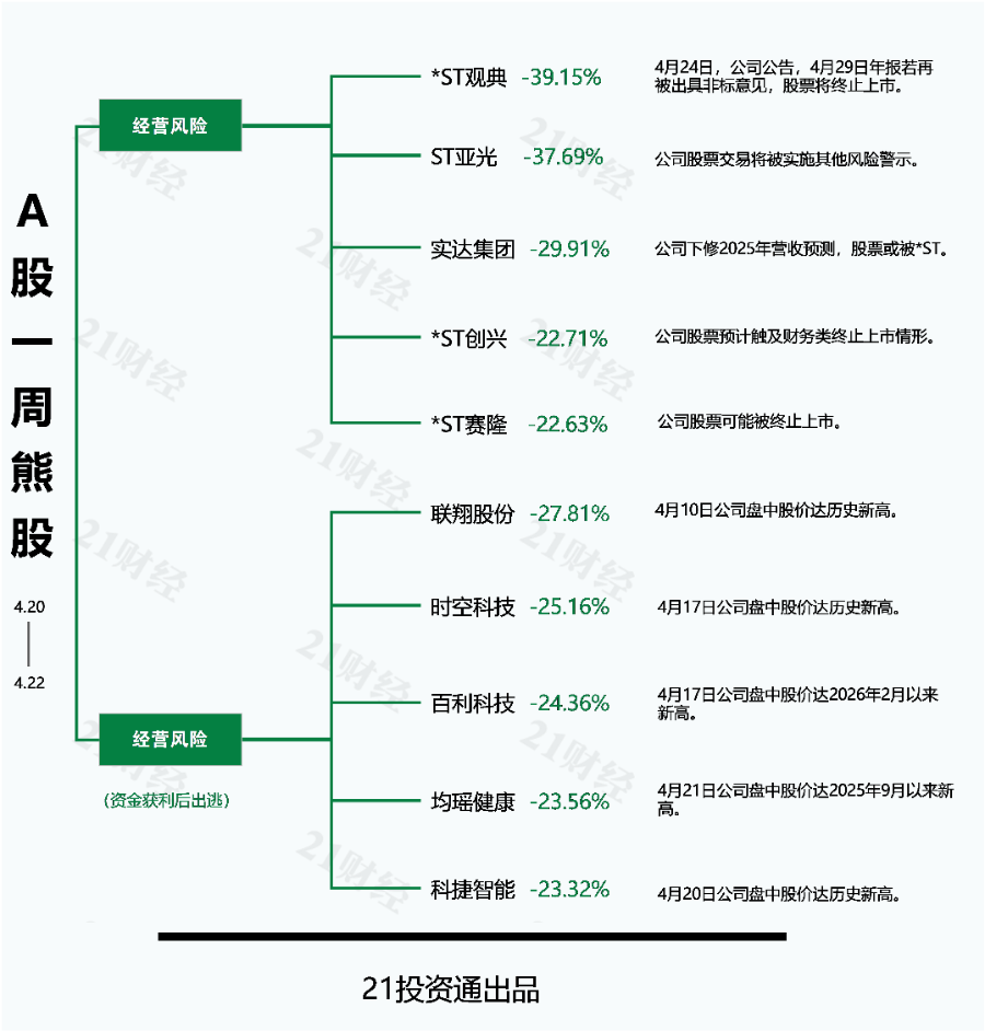 本期十大熊股中,*ST观典(688287.SH)以39.15%的跌幅成为本期的最熊股。ST亚光(300123.SZ)、实达集团(600734.SH)、联翔股份(603272.SH)、时空科技(605178.SH)等股的周跌幅均在22%以上。