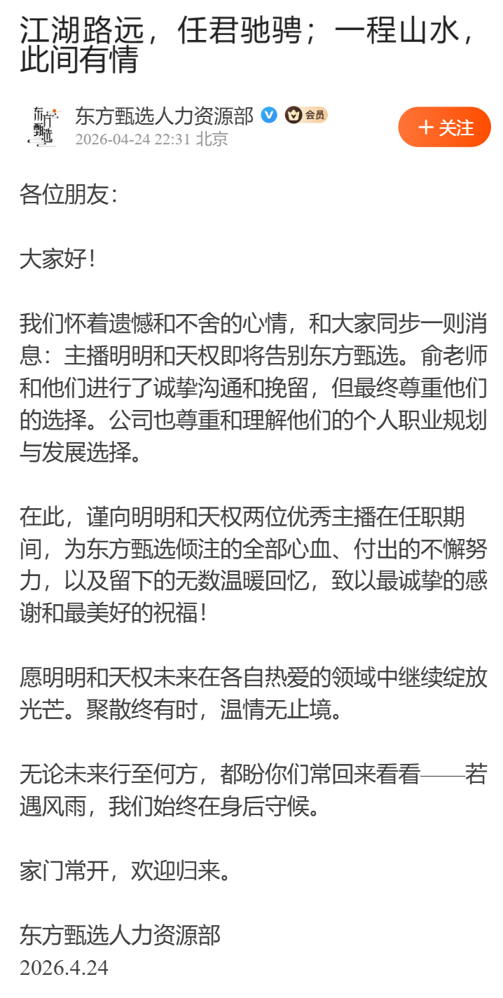 此前一天,东方甄选人力资源部发布公告,宣布明明和天权即将告别。公告称:“我们怀着遗憾和不舍的心情,和大家同步一则消息:主播明明和天权即将告别东方甄选。俞老师和他们进行了诚挚沟通和挽留,但最终尊重他们的选择。公司也尊重和理解他们的个人职业规划与发展选择。”