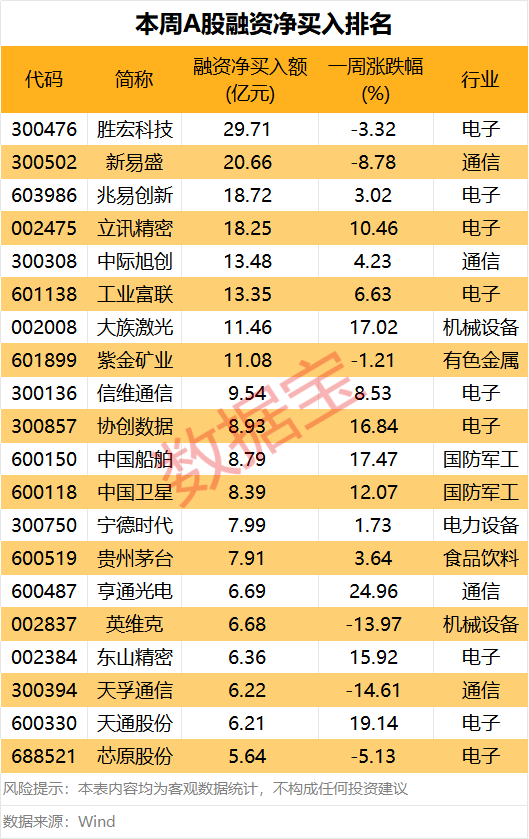 个股方面。除去近期上市个股,本周36股融资净买入额在3亿元以上。其中,胜宏科技、新易盛净买入额分别为29.71亿元、20.66亿元;兆易创新、立讯精密、中际旭创、工业富联、大族激光、紫金矿业6股紧随其后,净买入额均在10亿元以上。