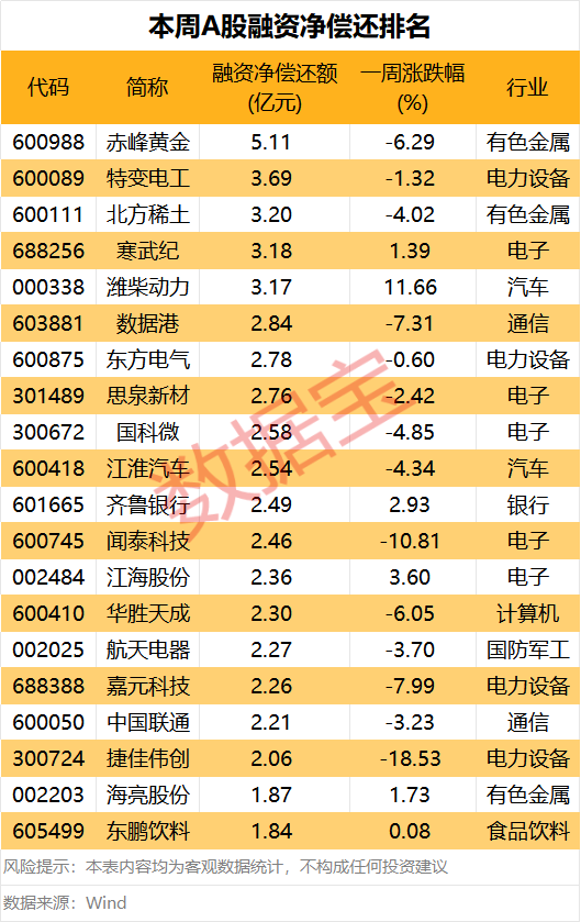 69股融资净偿还额均超过1亿元。赤峰黄金净偿还额居首,为5.11亿元;特变电工、北方稀土、寒武纪、潍柴动力4股净偿还额均超过3亿元。