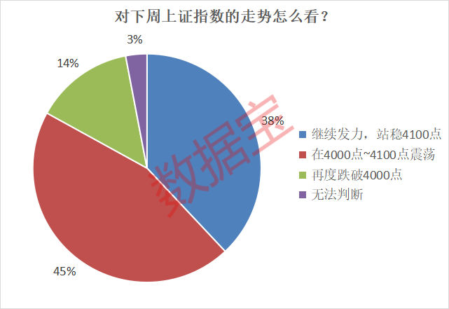本周A股先涨后跌,多数受访者认为下周市场将延续震荡或有望上涨。调查数据显示,45%的受访者认为下周市场将“在4000点~4100点震荡”,为最主流观点;38%的受访者认为下周市场将“继续发力,站稳4100点”;14%的受访者明确看空下周市场,认为A股将“再度跌破4000点”。