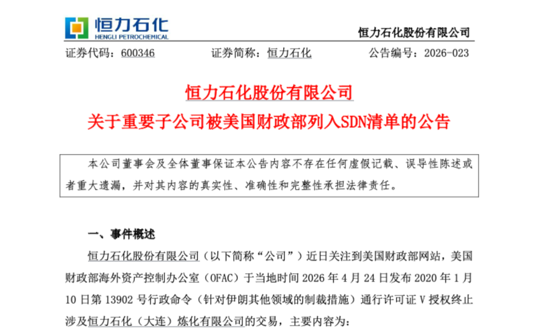恒力石化(600346)4月26日晚间发布《关于重要子公司被美国财政部列入SDN清单的公告》。